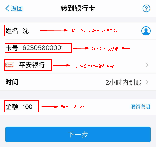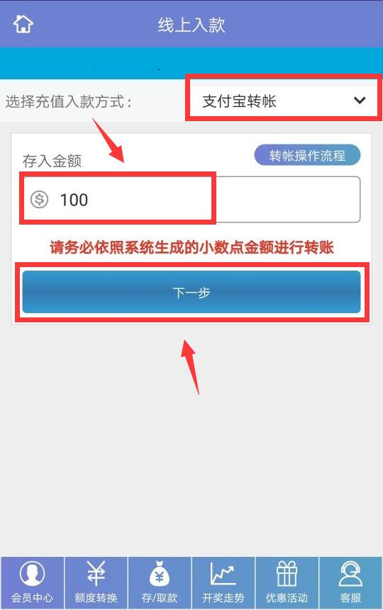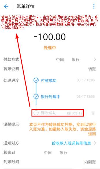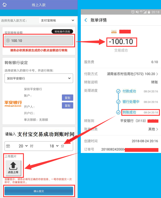 进入支付宝转账页面后,记录/复制好公司收款银行账户,登陆您的支付宝进行转账,且支付宝实际转账金额必须与页面显示(带有小数点)的金额一致。转账成功后,>等待转账详情--显示到账成功。按照提示填写您的到账时间,并上传您的转账详情截图,在点击确认提交。(温馨提示:使用支付宝转账至平安银行是即时到账的;